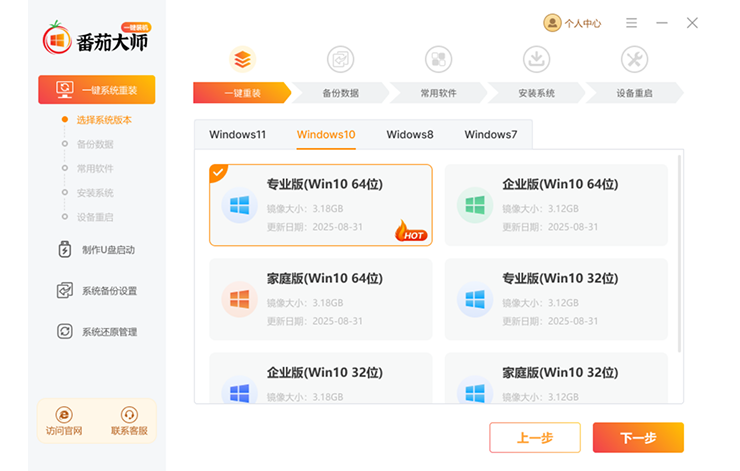 1、打开番茄系统版软件(建议退出安全软件后再打开软件),番茄系统软件推荐安装 Windows 10,点击”立即重装“进行